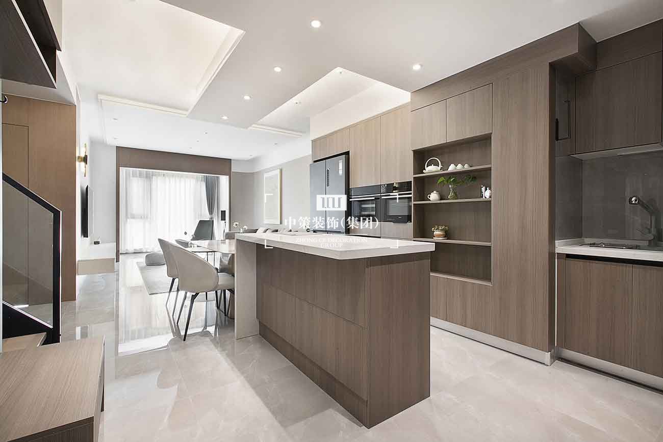①本案设计师把厨房餐厅连成一个整体,扩大了空间使用功能,增强一楼的采光。优化餐厅客厅之间的动线,增加家人的互动性。