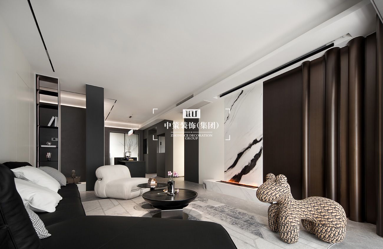 2.客厅空间:客厅摒弃繁杂的装饰搭配,注重质感的体现。顶面和墙面采都用微水泥饰面,以黑、白、灰、三色突出空间整体概念,搭配客厅的大落地窗,使得整个空间在光影的变化下显现斑驳的肌理。此外空间在黑白的基调上搭配了熊猫白岩板,以及弧形拉丝不锈钢材质的运用,提升空间质感与层次感,让空间在沉稳中又能凸显出别样的细腻与柔和。