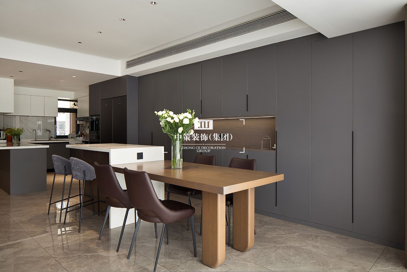 ②厨房:一层厨房打开后与餐厅、客厅连成一个整体,拓宽了整个公共区域的活动空间,使房子显得更大气,动线也更加灵动有序。中西厨相连,岛台与餐桌采用一体设计,营造出温馨的家庭氛围。